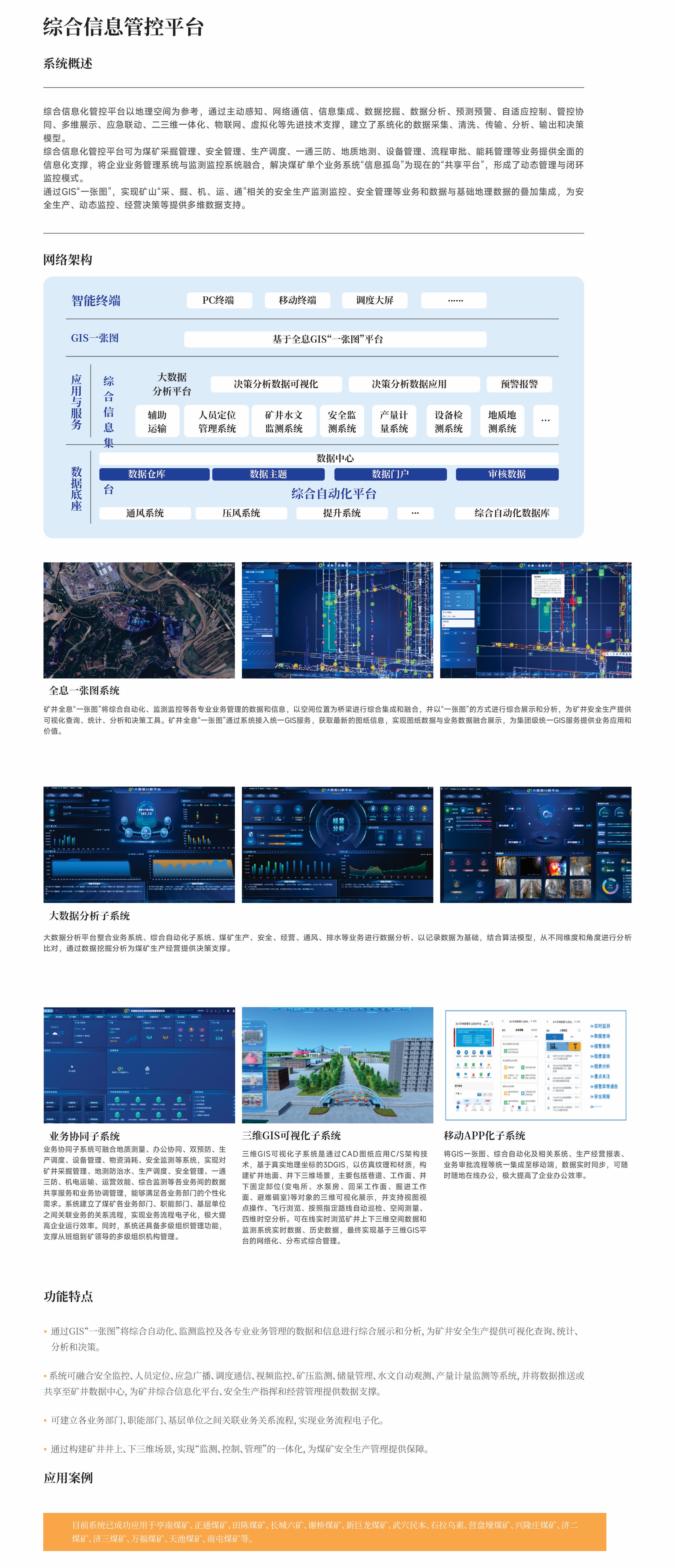 综合信息化管控平台可为煤矿采掘管理、安全管理、生产调度、一通三防、地质地测、设备管理、流程审批、能耗管理等业务提供全面的信息化支撑,将企业业务管理系统与监测监控系统融合,解决煤矿单个业务系统“信息孤岛”为现在的“共享平台”,形成了动态管理与闭环监控模式。