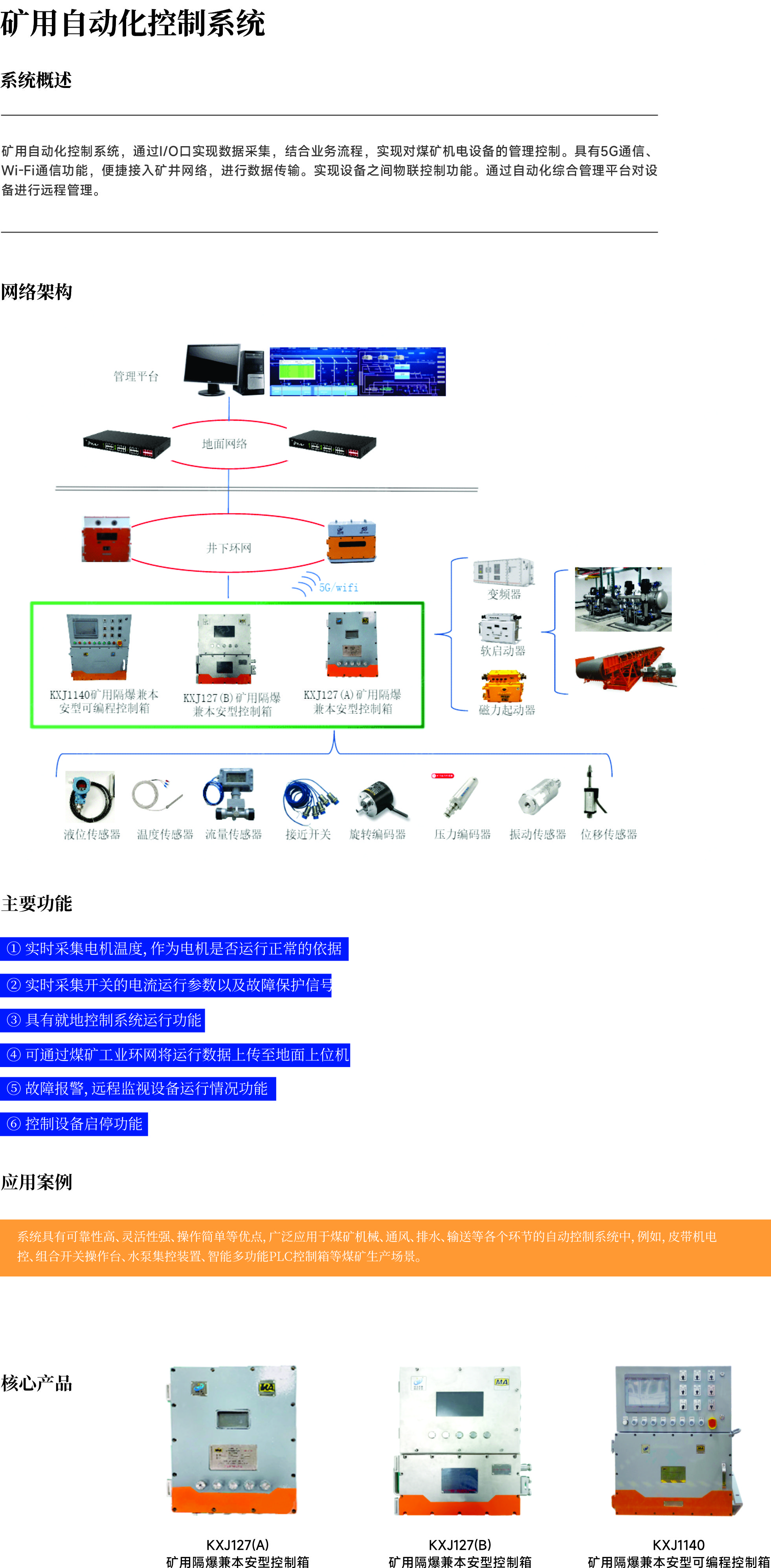矿用自动化控制系统,通过I/O口实现数据采集,结合业务流程,实现对煤矿机电设备的管理控制。具有5G通信、Wi-Fi通信功能,便捷接入矿井网络,进行数据传输。实现设备之间物联控制功能。通过自动化综合管理平台对设备进行远程管理。