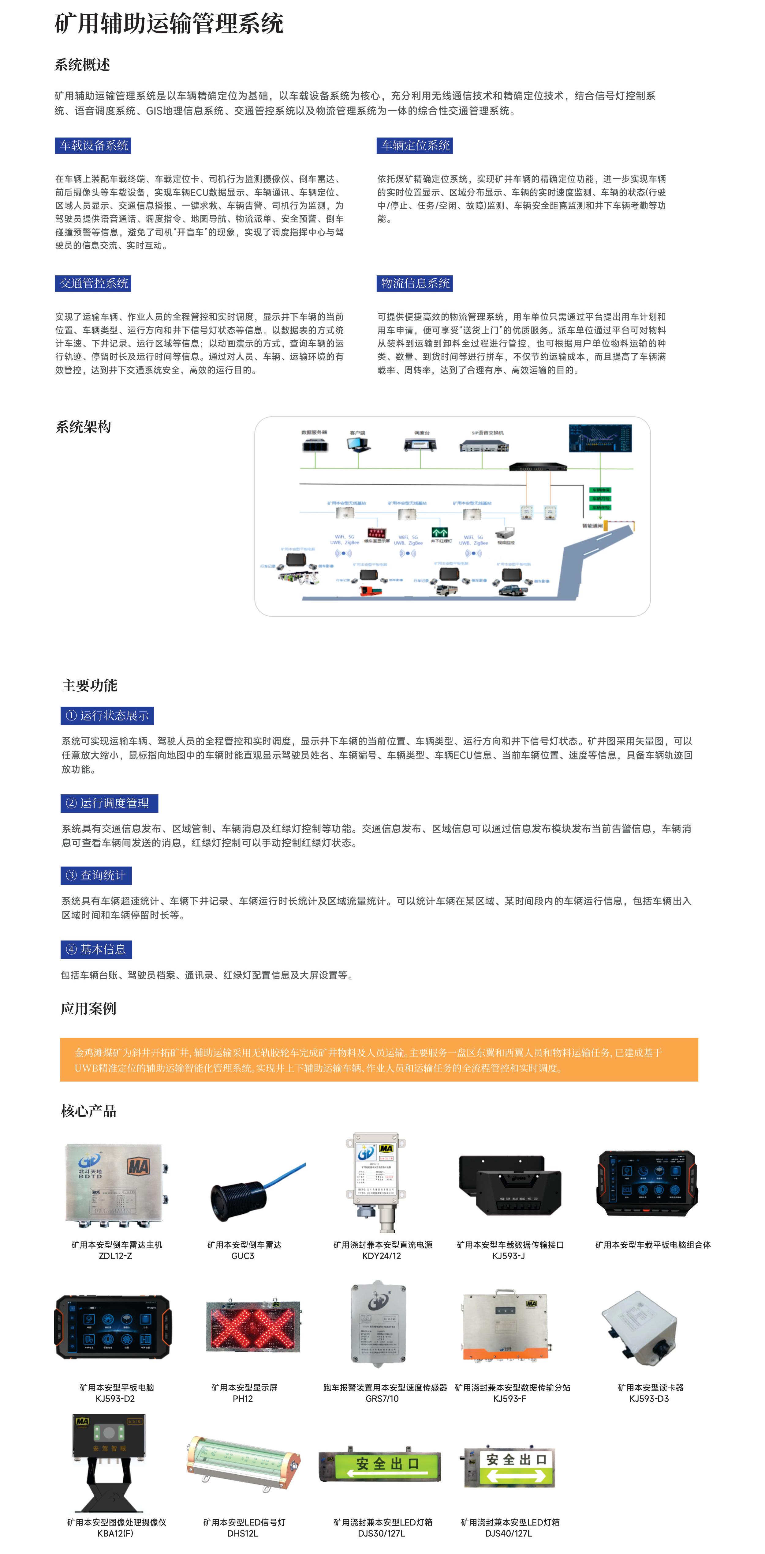 矿用辅助运输管理系统是以车辆精确定位为基础,以车载设备系统为核心,充分利用无线通信技术和精确定位技术,结合信号灯控制系统、语音调度系统、GIS地理信息系统、交通管控系统以及物流管理系统为一体的综合性交通管理系统。