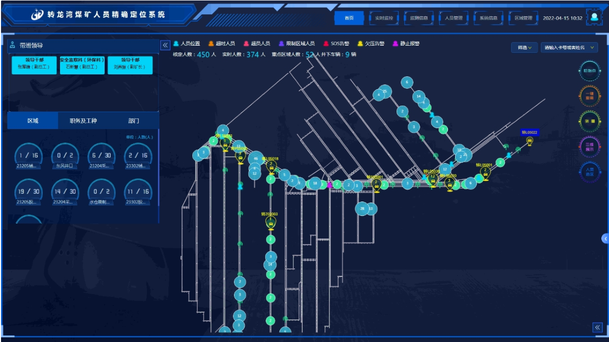 转龙湾煤矿人员精确定位系统实现煤矿井下30cm的精确定位,使用真实比例的全数字矿图,实现了井下场景的真实还原。包含人员及车辆实时定位、轨迹跟踪、考勤及出入井管理、一键求救、行为检测及报警、区域管理、统计报表等管理功能。通过实时监测人员精确位置,规范人员安全行为,为安全管理提供有力支持。井下使用115台读卡分站,在各辅运大巷、胶运及回风顺槽、采掘工作面、主要辅助运输大巷交叉点、变电所、泵房、并底车场、避难硐室、风井等地点实现了全覆盖的精确定位。