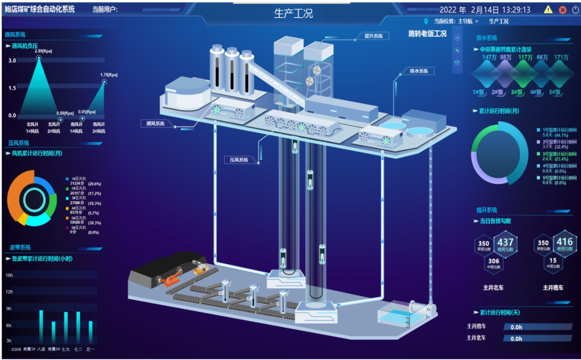 鲍店煤矿于2020年进行综合自动化系统升级改造,主要包括综合自动化系统软件平台版本及功能升级,对现场各子系统采集进行接口定制开发、实时数据接入、人机界面融合定制开发、实时历史数据库存储。建立全矿井监测、控制、管理一体化的、基于工业网、办公网的大型管控系统,通过历史回溯、视频联动、曲线报表查询、操作记录、排水系统全自动、皮带智能煤流等功能,实现对各子系统关键生产环节实施远程操作、集中监控、统-调度,使矿井高效集中生产,达到减员增效、降低成本的目的,提高矿井整体生产管控水平。