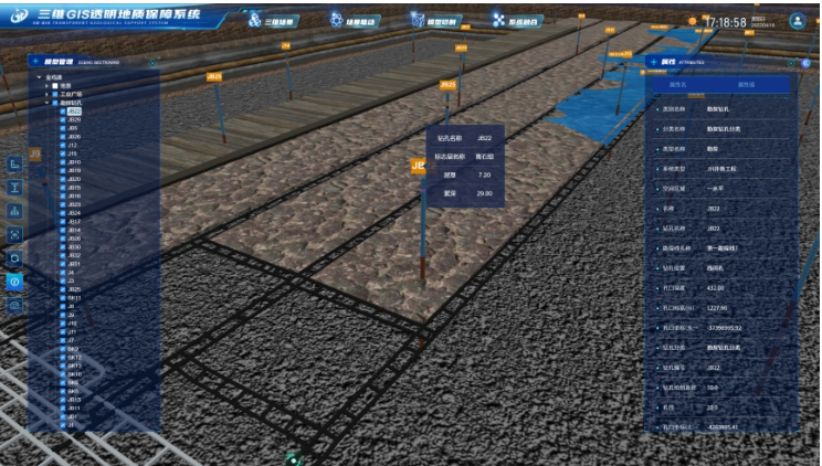 金鸡滩北斗地质保障系统实现了高精度动态地质模型建模和自动处理,为煤矿开采过程提供地质数据存储、转换、管理、查询、分析和可视化服务。此外,三维地质模型具备了智能化分析功能,研发了基于算法对水流等数值进行模拟计算,基于工程生产数据进行模拟分析等功能。还实现了三维地层和巷道模型的一体化任意线剖切、分层隐藏透明显示、距离高程量测等功能。