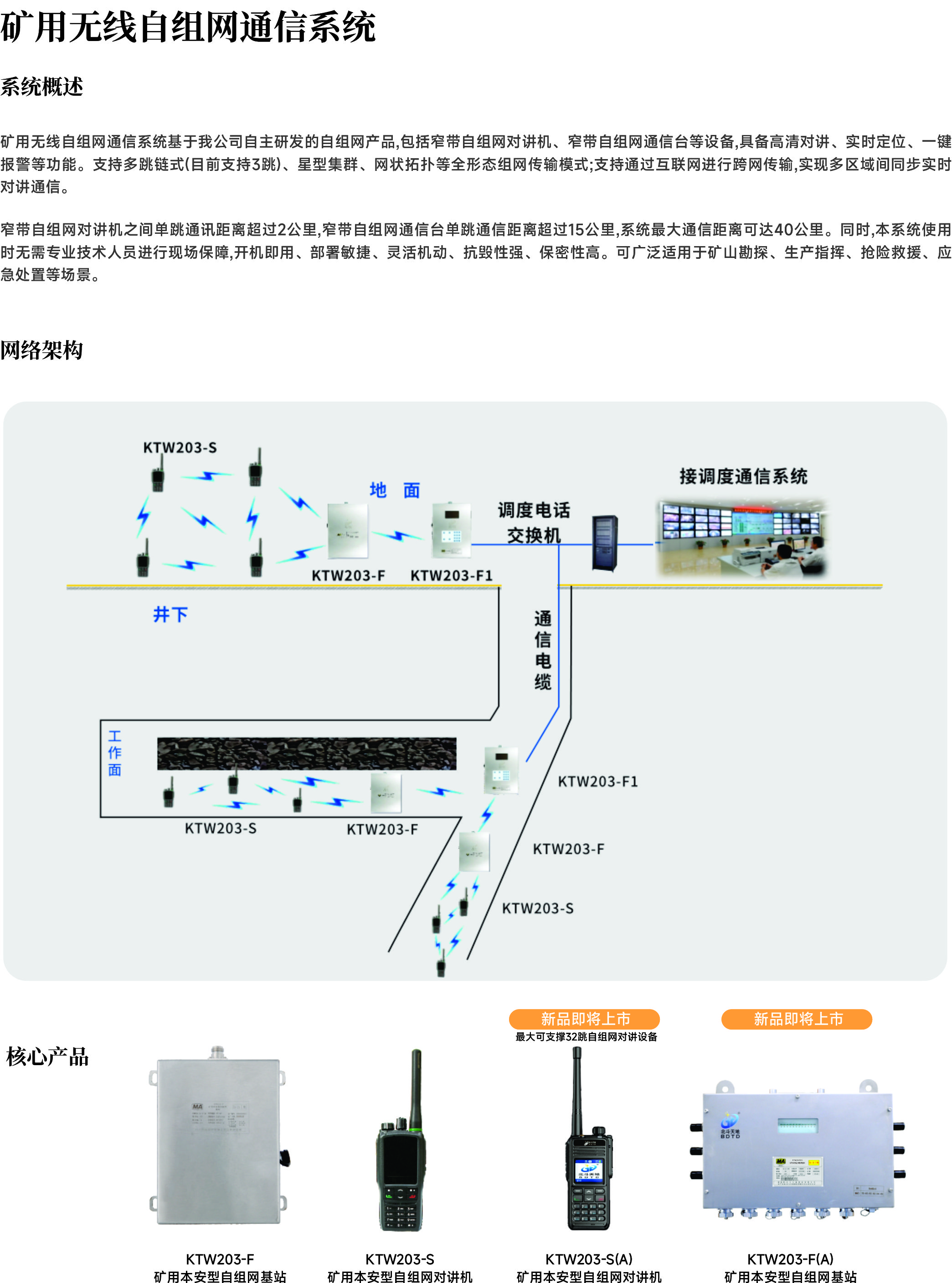 矿用无线自组网通信系统基于我公司自主研发的自组网产品,包括窄带自组网对讲机、窄带自组网通信台等设备,具备高清对讲、实时定位、一键报警等功能。支持多跳链式(目前支持3跳)、星型集群、网状拓扑等全形态组网传输模式;支持通过互联网进行跨网传输,实现多区域间同步实时对讲通信。