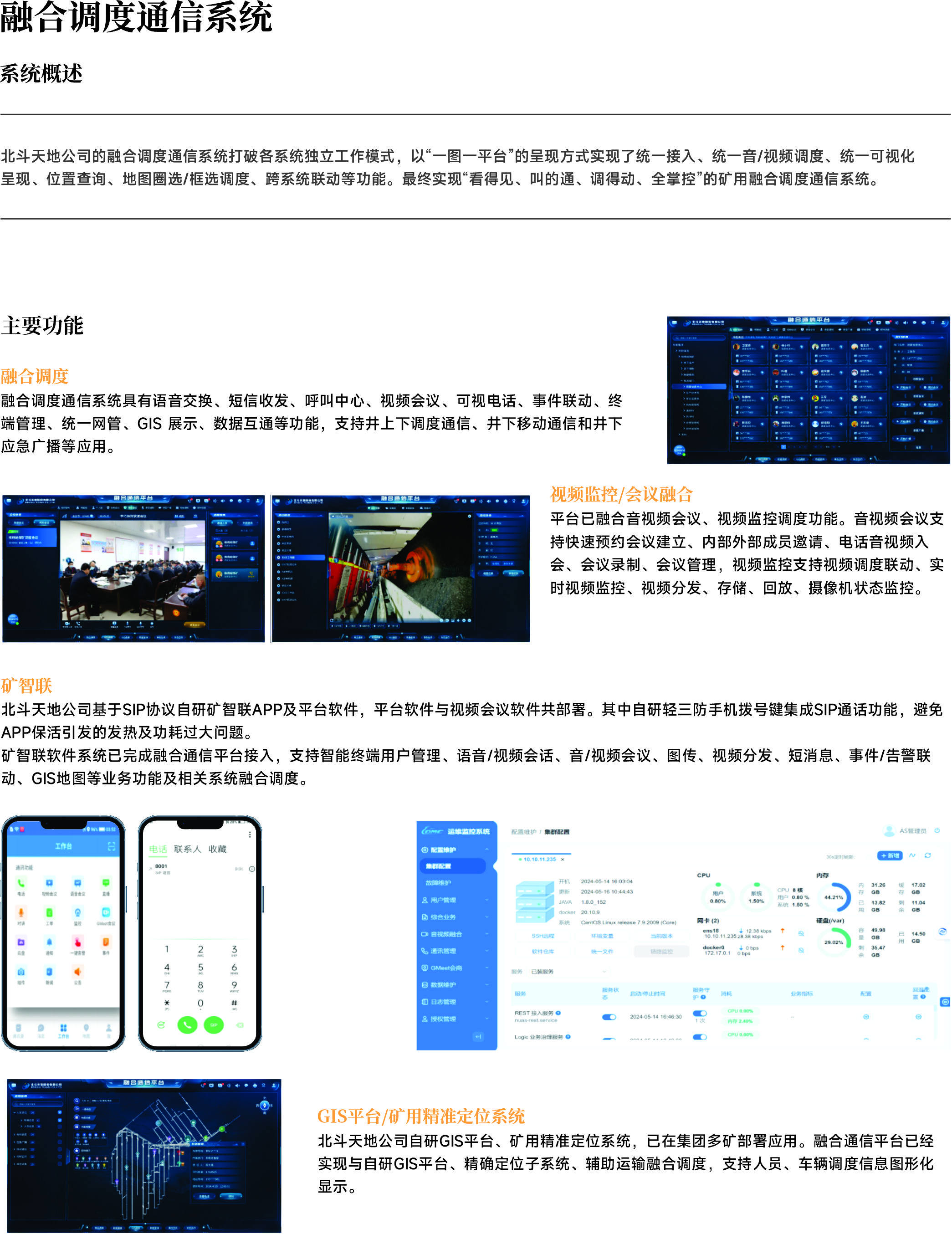 北斗天地公司的融合调度通信系统打破各系统独立工作模式,以“一图一平台”的呈现方式实现了统一接入、统一音/视频调度、统一可视化呈现、位置查询、地图圈选/框选调度、跨系统联动等功能。最终实现“看得见、叫的通、调得动、全掌控”的矿用融合调度通信系统。