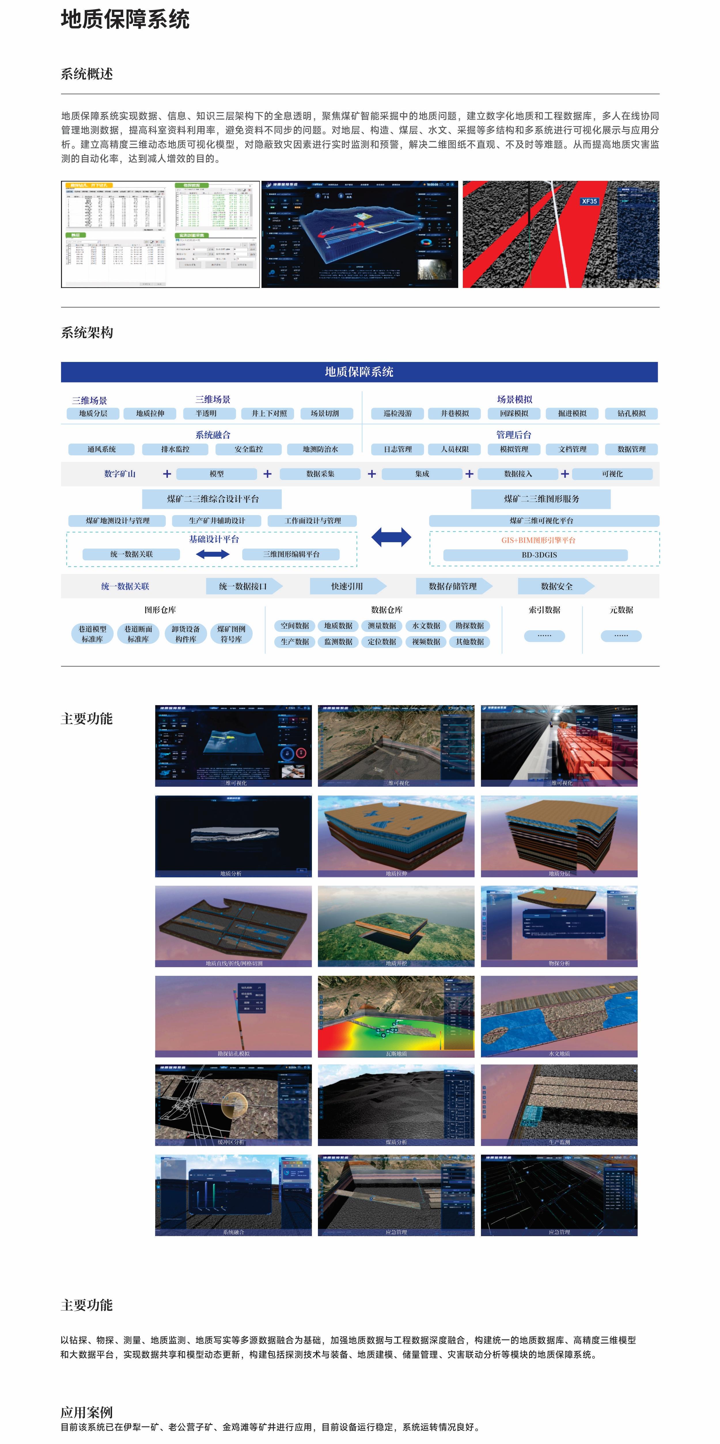 地质保障系统实现数据、信息、知识三层架构下的全息透明,聚焦煤矿智能采掘中的地质问题,提高地质灾害监测的自动化率,达到减人增效的目的