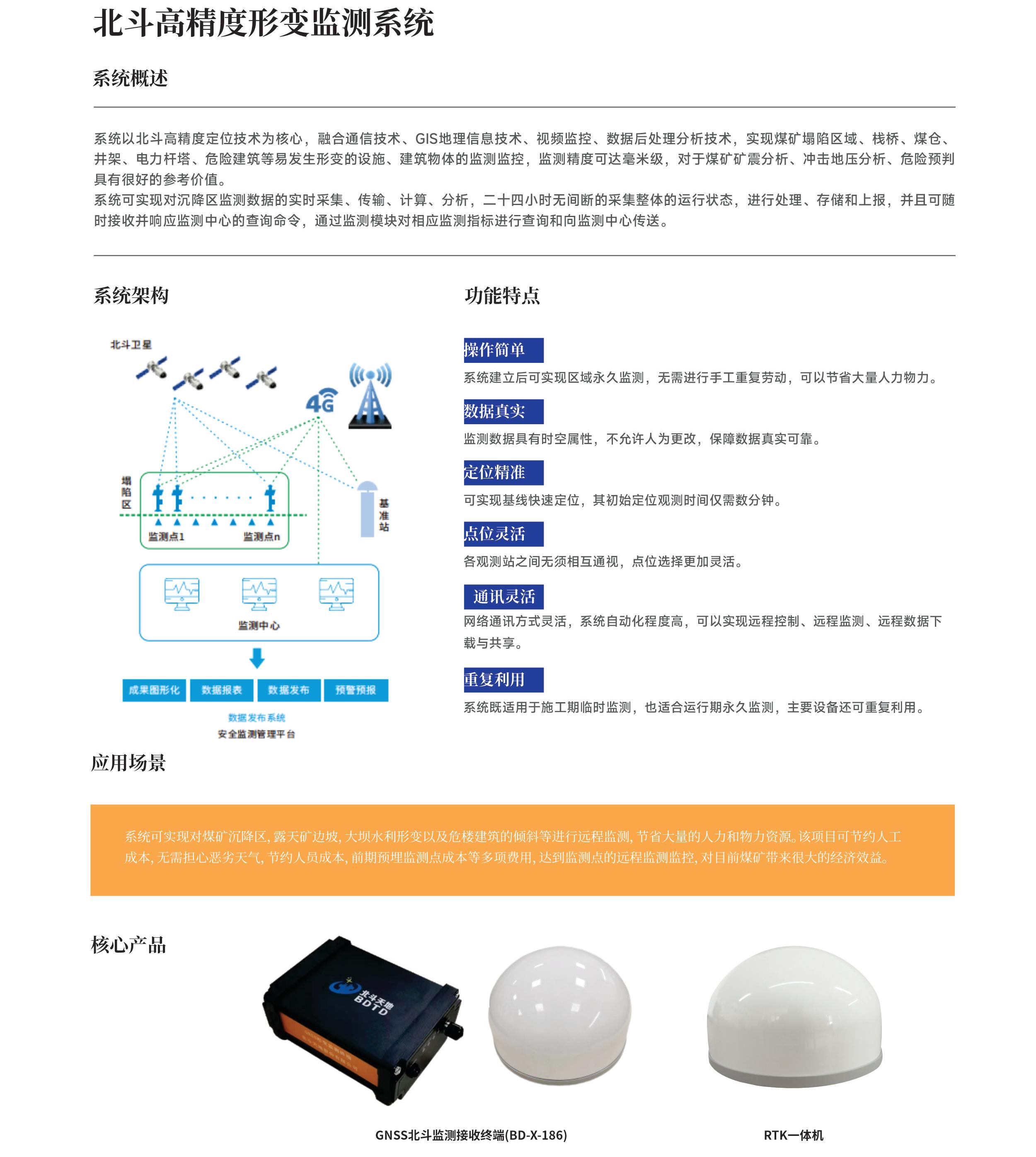 系统以北斗高精度定位技术为核心,融合多种技术,实现易发生形变的设施、建筑物体的监测监控,监测精度可达毫米级,对于煤矿矿震分析、冲击地压分析、危险预判具有参考价值