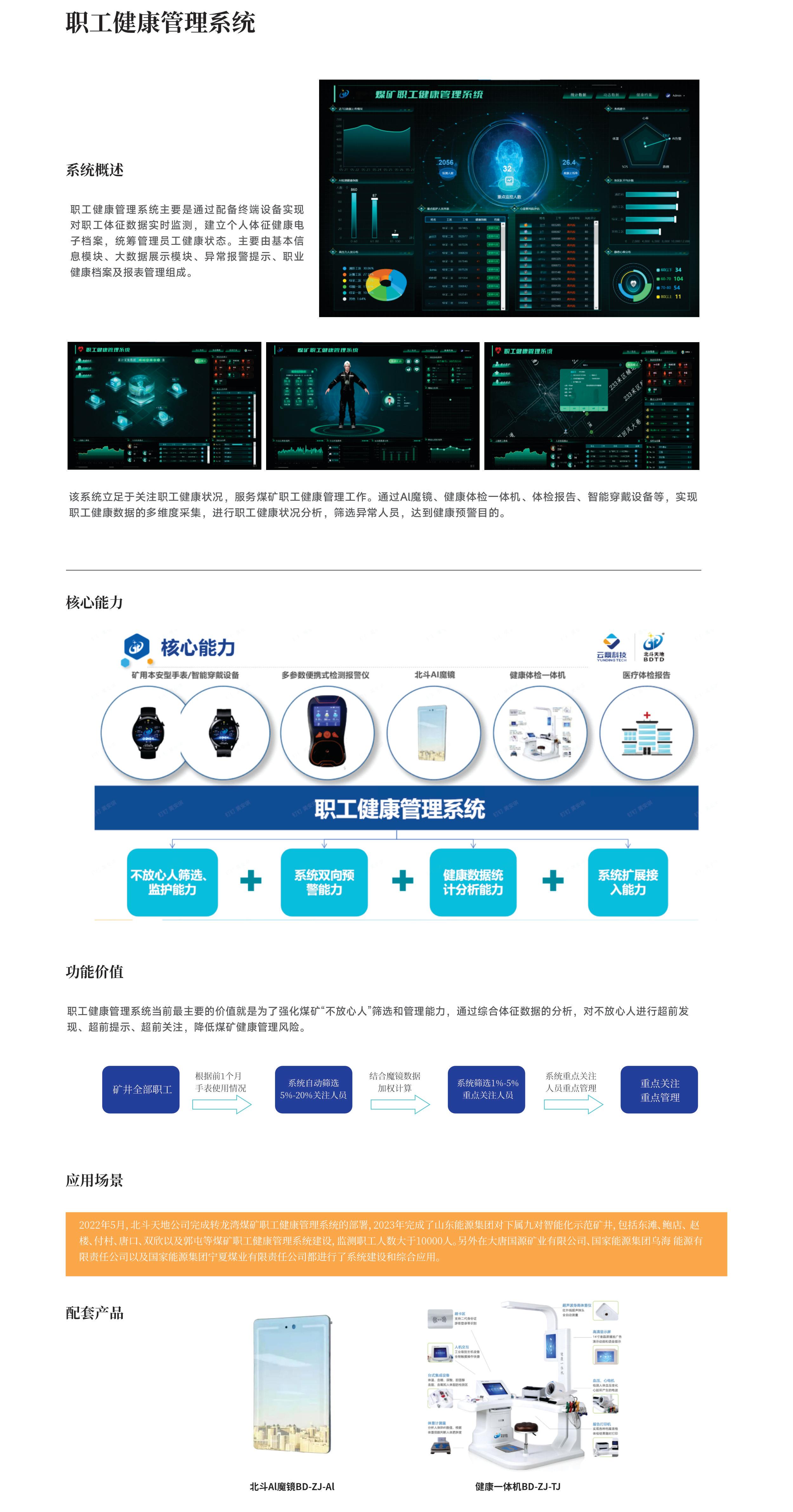 通过配备终端设备实现对职工体征数据实时监测,建立个人体征健康电子档案,统筹管理员工健康状态。主要由基本信息模块、大数据展示模块、异常报警提示、职业 健康档