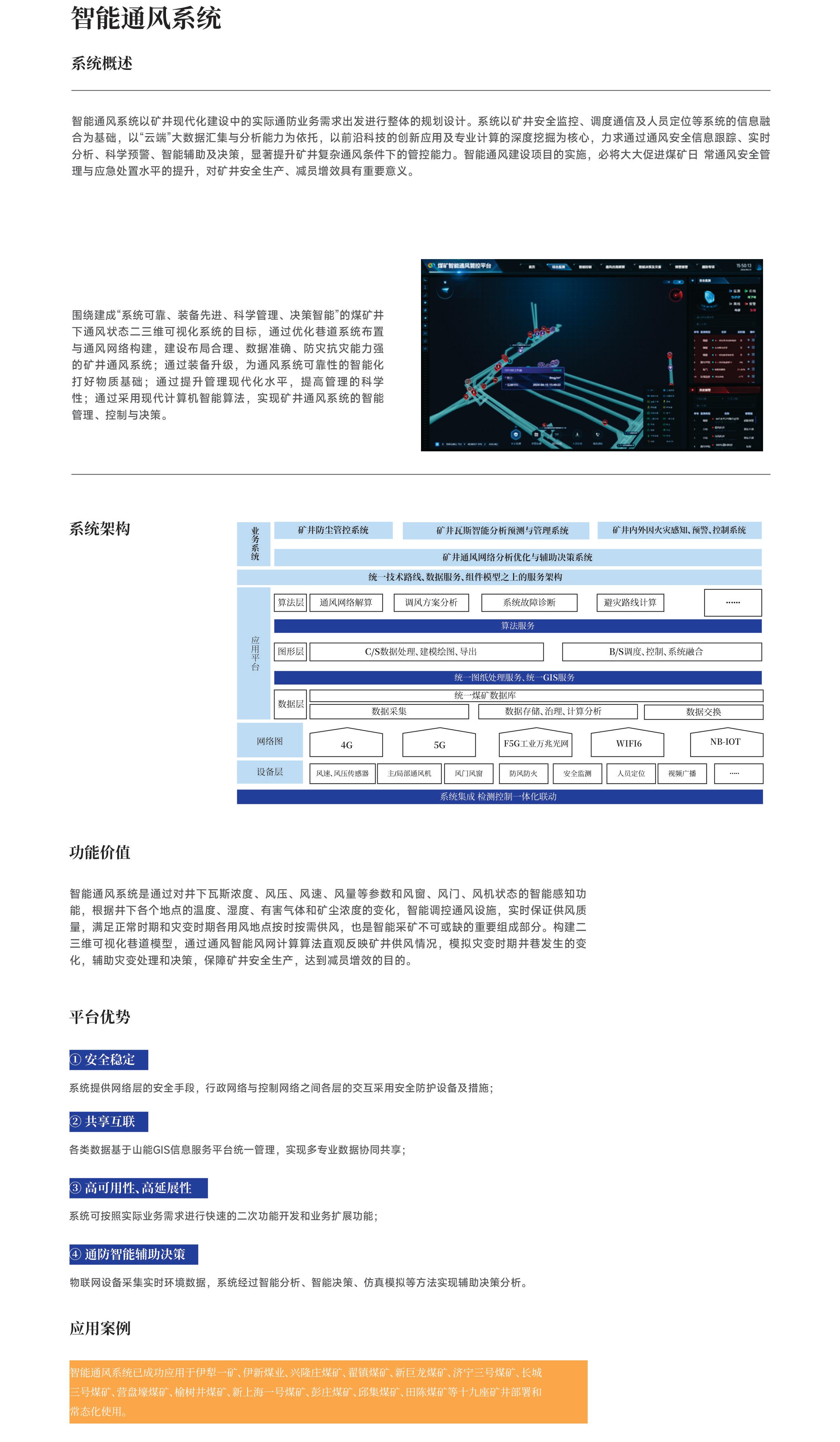 系统以矿井安全监控、调度通信及人员定位等系统的信息融合为基础,以“云端”大数据汇集与分析能力为依托,以前沿科技的创新应用及专业计算的深度挖掘为核心。